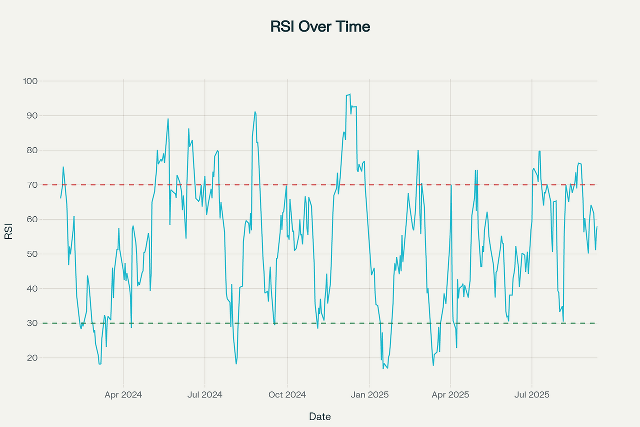 RSI(Relative Strength Index)는 70 이상 과매수, 30 이하 과매도 구간으로 해석한다.