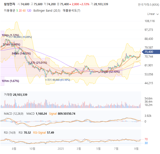 - 9/13: 75,400원 (+2.72%, 반등) 차트 패턴: 지지선 72,000원 유지 후 반등, MACD 골든크로스 형성. 거래량 증가로 상승 모멘텀 강화.