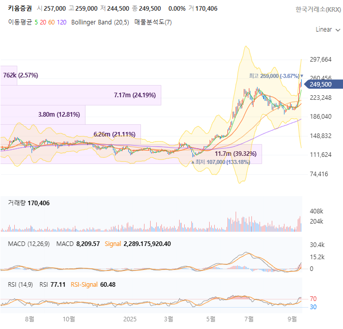 - 9/13: 249,500원 (보합, 고점 테스트) 차트 패턴: 정책 기대감으로 안정적 상승, 볼린저 밴드 상단 근접. RSI 60대 중반으로 매수 지속 가능.