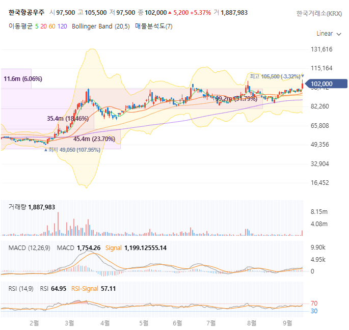 한국항공우주의 최근 주가 캔들 차트를 살펴보면, 2025년 초부터 강한 상승 추세를 이어온 모습입니다. 특히 9월 초에는 장중 주가가 105,500원까지 치솟으며 52주 최고가를 경신한 후 일부 조정을 받았습니다. 거래량 측면에서 8월 말까지 외국인과 기관의 매도세로 조정 국면이 있었으나, 9월 들어 거래량이 증가하며 상승 모멘텀이 재개되었습니다. 큰 양봉이 잇따라 출현하고 거래량이 뒷받침된 것은 추세적 강세를 시사하며, 단기 조정에도 불구하고 전반적인 우상향 흐름이 유지되고 있습니다.