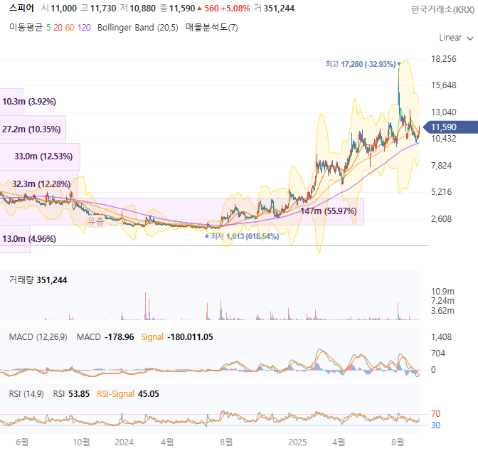 스피어 주가는 2023년 6월 1,613원의 역사적 저점을 형성한 후 현재 11,030원까지 상승하여 약 584%의 상승률을 기록했다. 2025년 3월 합병 발표 이후 급등세가 가속화되었으며, 8월 스페이스X 계약 발표 시점에서 14,170원의 52주 최고가를 기록했다.