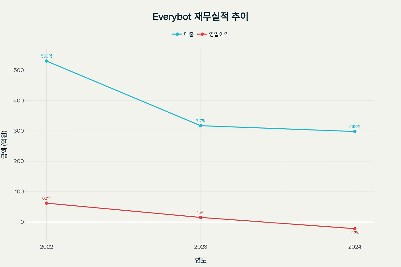에브리봇의 최근 3년간 재무성과는 하향세를 보이고 있습니다. 2022년 매출액 530억원에서 2024년 298억원으로 43.8% 감소하였으며, 영업이익은 2022년 62억원 흑자에서 2024년 22억원 적자로 전환되었습니다.