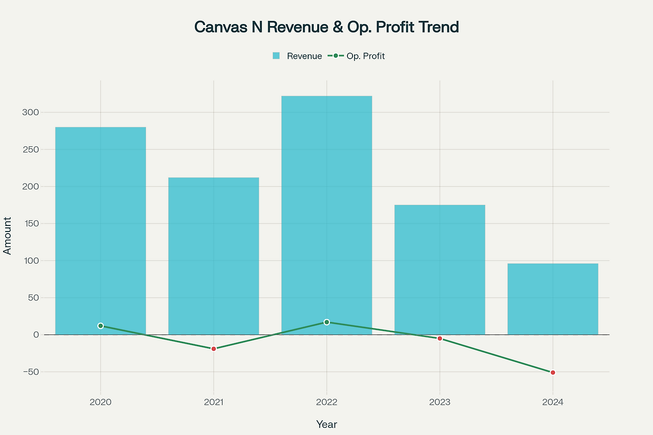 캔버스엔의 재무성과는 2020년 이후 극심한 변동성을 보이고 있습니다. 매출액은 2020년 280억원에서 2022년 322억원까지 증가했으나, 2023년 175억원, 2024년 96억원으로 연속 감소했습니다. 특히 2024년 매출액 감소율은 전년 대비 45.1%에 달하며, 이는 주력 사업인 드라마 제작 경쟁력의 급속한 약화를 시사합니다.