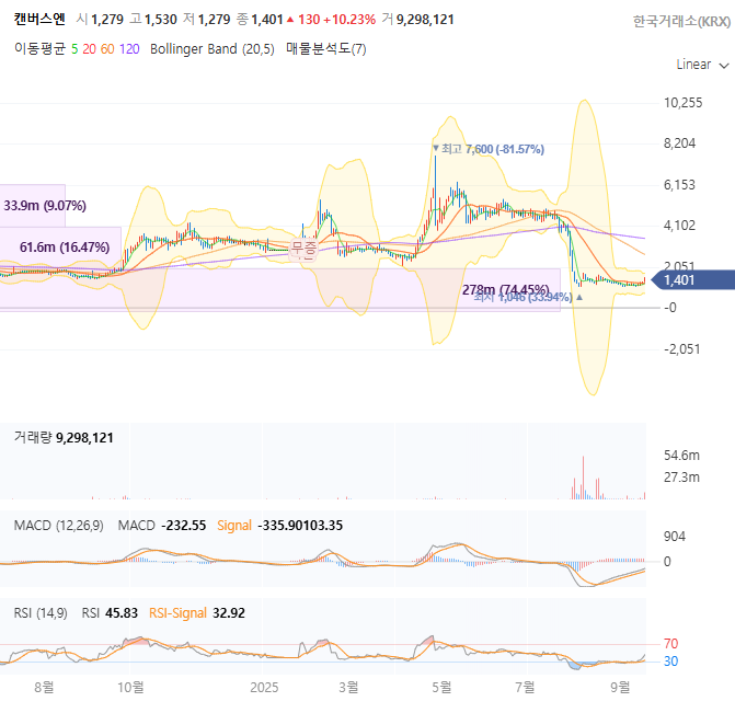드라마 제작 전문기업인 캔버스엔(종목코드: 210120)은 현재 심각한 재무적 어려움과 급격한 주가 변동성을 보이고 있습니다. 2025년 9월 17일 현재, 주가는 1,401원으로 전일 대비 10.23% 상승했으나, 52주 최고가 5,850원 대비 76.1% 하락한 상태입니다. 기업의 매출액은 2023년 175억원에서 2024년 96억원으로 45.1% 급감했으며, 영업손실은 5억원에서 51억원으로 10배 이상 확대되었습니다. 이러한 재무 악화에도 불구하고, 과매도 구간에서의 기술적 반등 가능성과 중국 한한령 해제 기대감, STO 사업 진출 등 새로운 성장 모멘텀이 주목받고 있습니다.