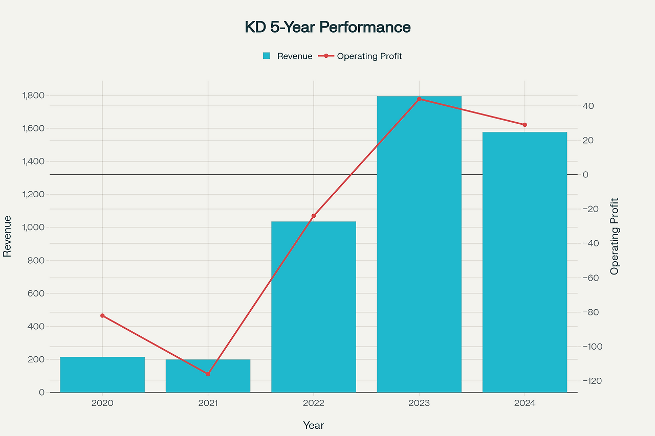 KD의 최근 5년간 재무 성과를 살펴보면 2024년 흑자전환에 성공한 것이 가장 주목할 만한 성과입니다. 매출액은 2020년 214억원에서 2024년 1,576억원으로 크게 성장했으며, 특히 2022년부터 본격적인 성장 궤도에 진입했습니다.